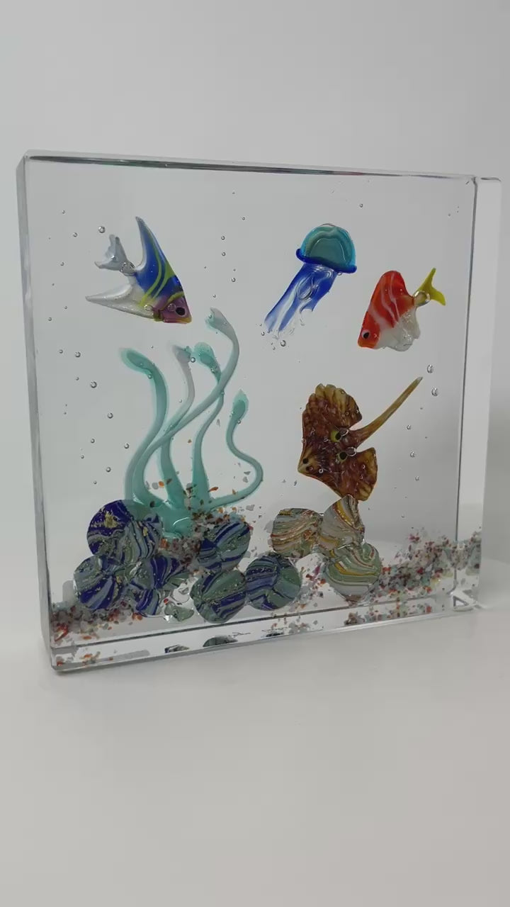 Add a touch of elegance to your home decor with this beautiful Aquarium. This is a true masterpiece of hand-formed Murano Glass artistry.  Each sea creature is made by hand in this detailed and difficult process!