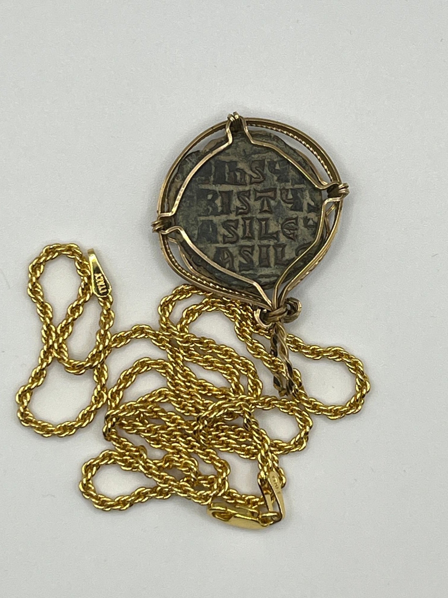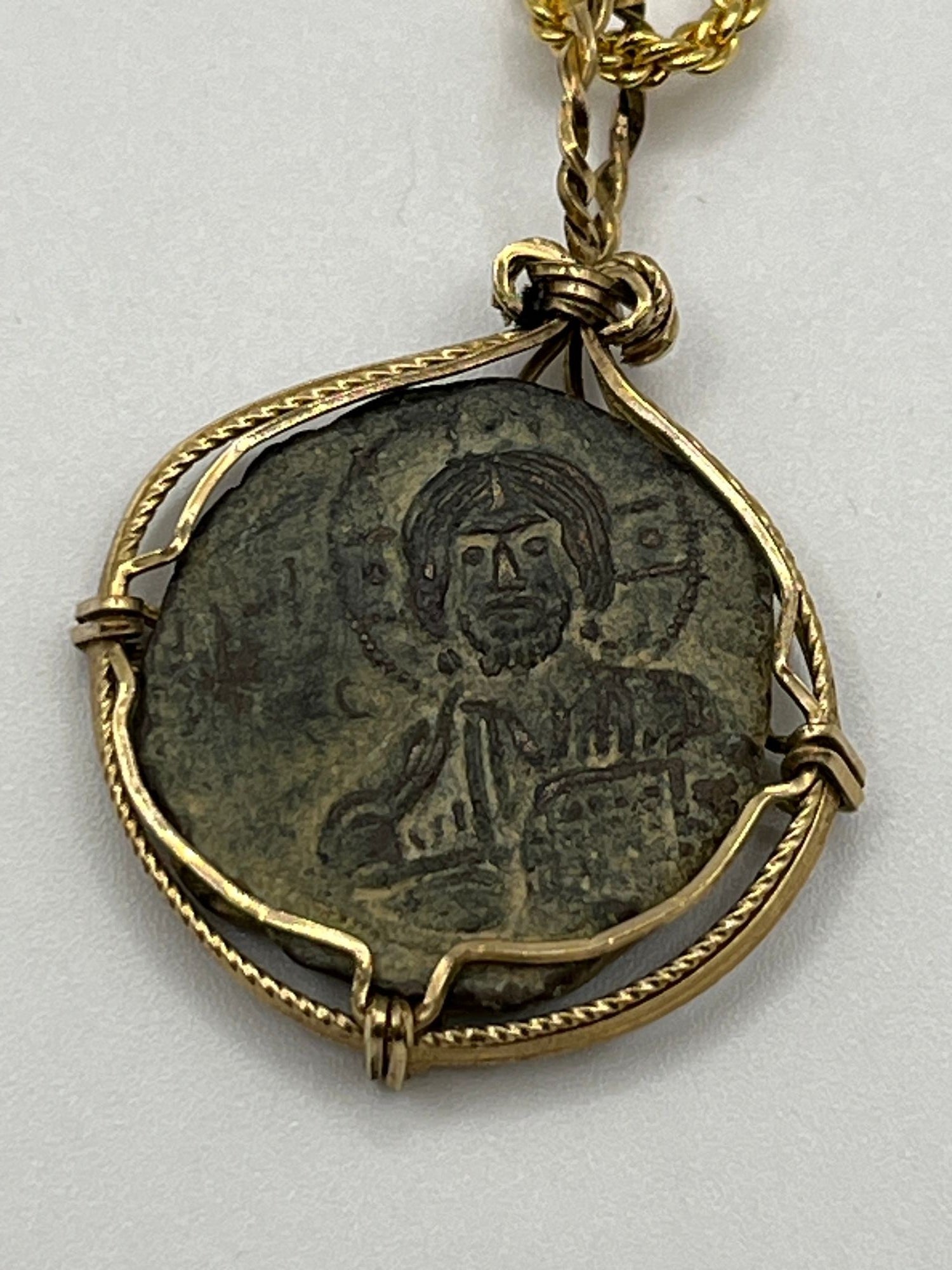 Acquire a piece of ancient history with this genuine bronze coin, the earliest known to bear the likeness of Jesus Christ and Mary, masterfully converted into an exquisite pendant necklace. (#422)