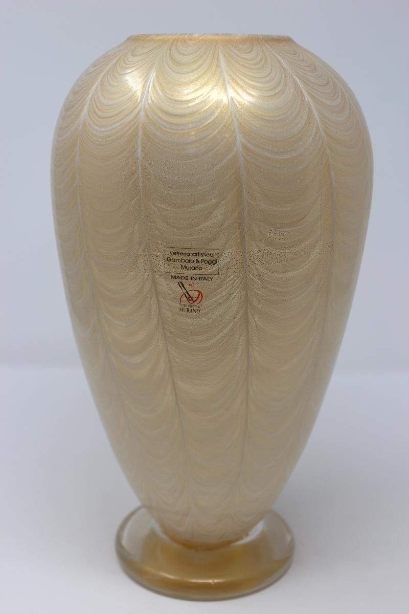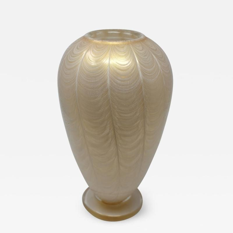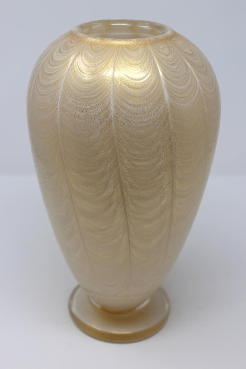 Incredibly beautiful vase with a "feathered" look to the glass. Inclusion of 24K gold powder make this piece noteworthy. Signed by Artist. 13" x 7"