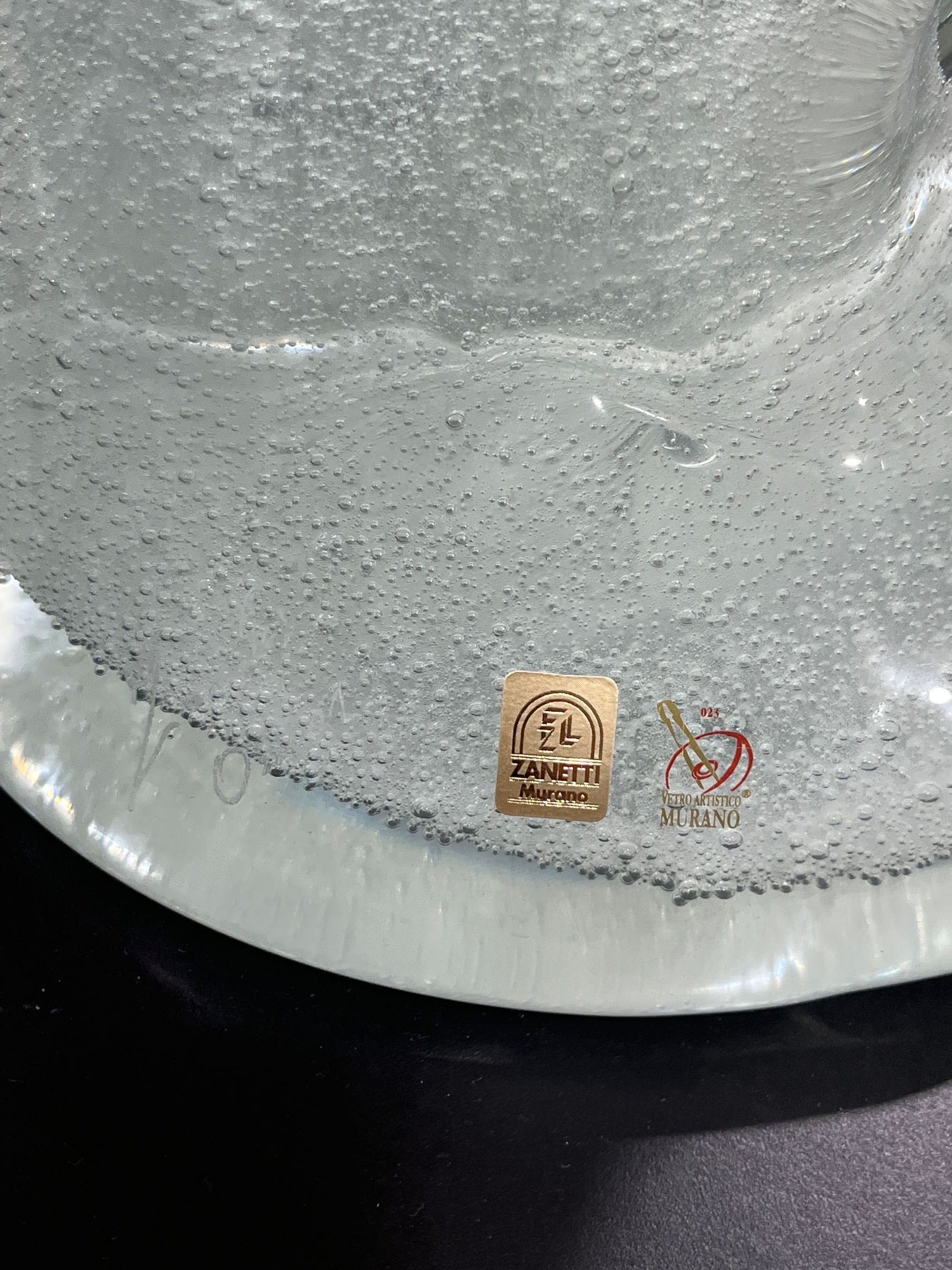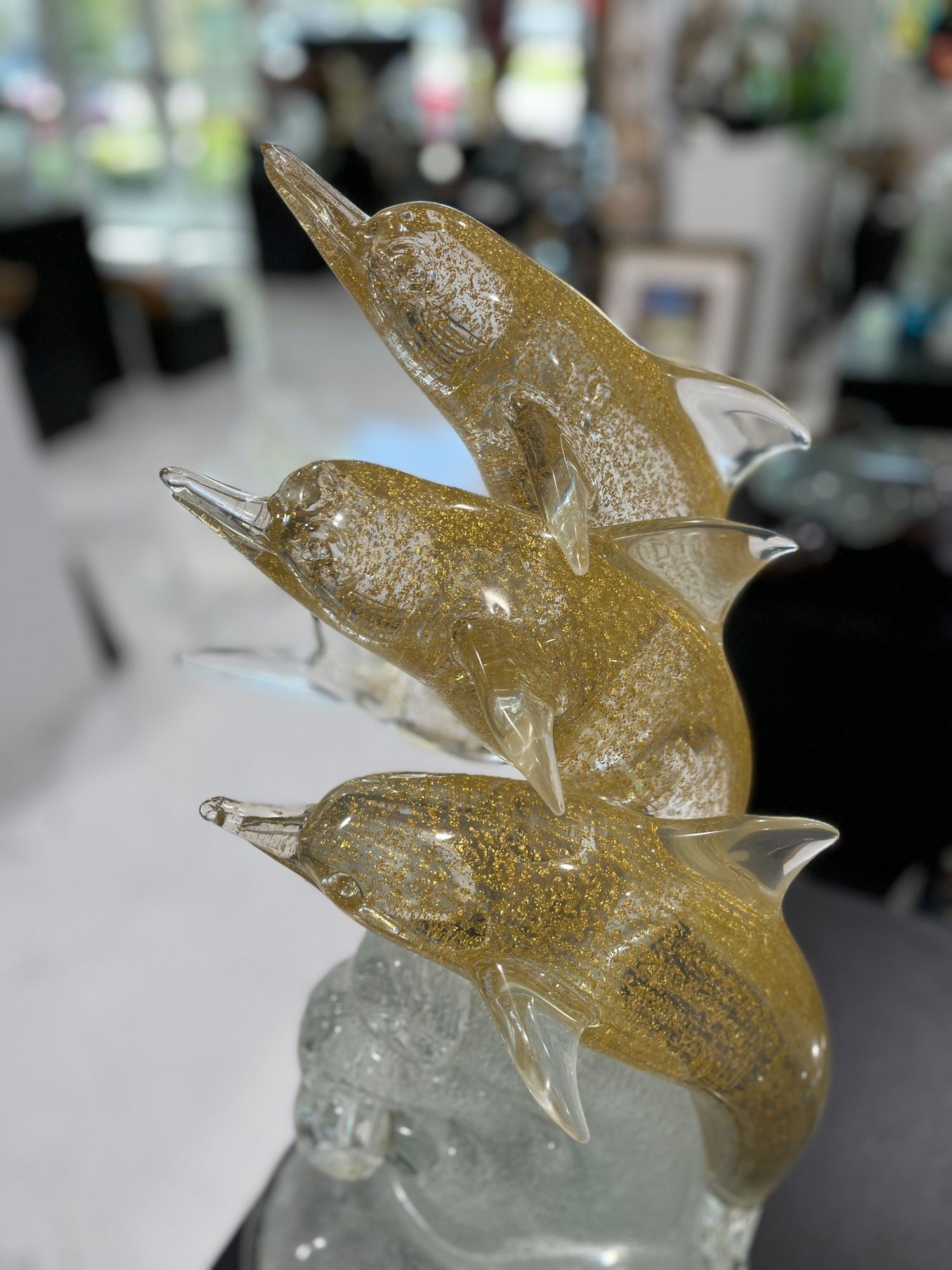 This lovely group of three dolphins was handmade by world renowned Óscar, Zanetti, of Murano, Italy. Made with 24 karat gold dust infused into the glass. Stands 21 inches tall. Signed by the artist.