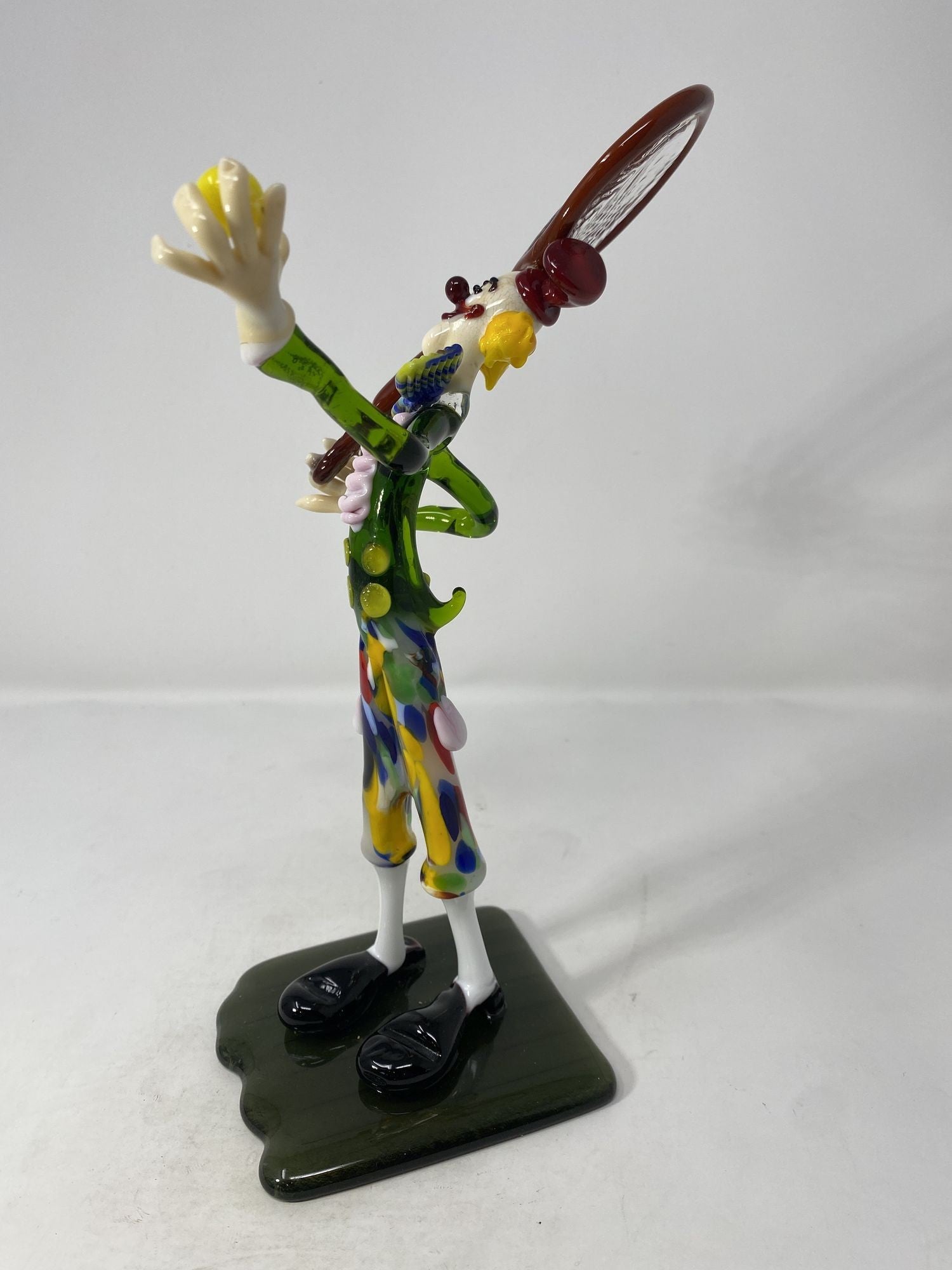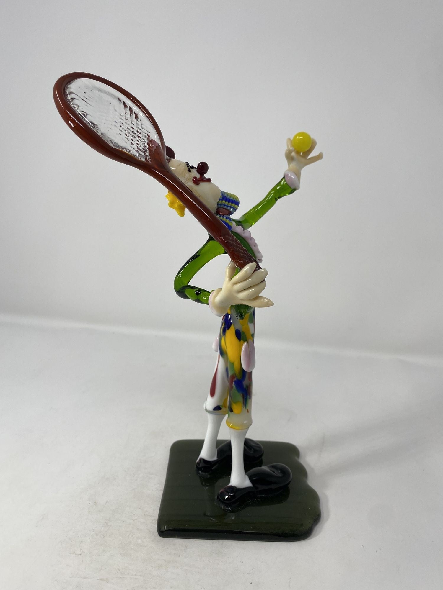 Very cute Murano Glass Clown Tennis Player made by one of Murano's top Artisans. Great detailing and wonderful colors. Great gift item, or as a decor accent. Measures 9.5" tall.
