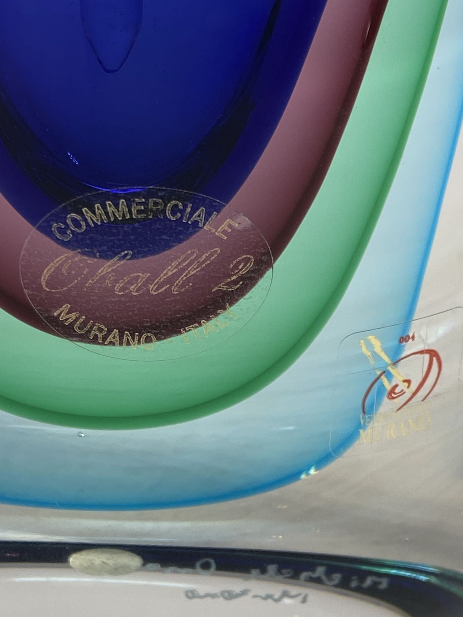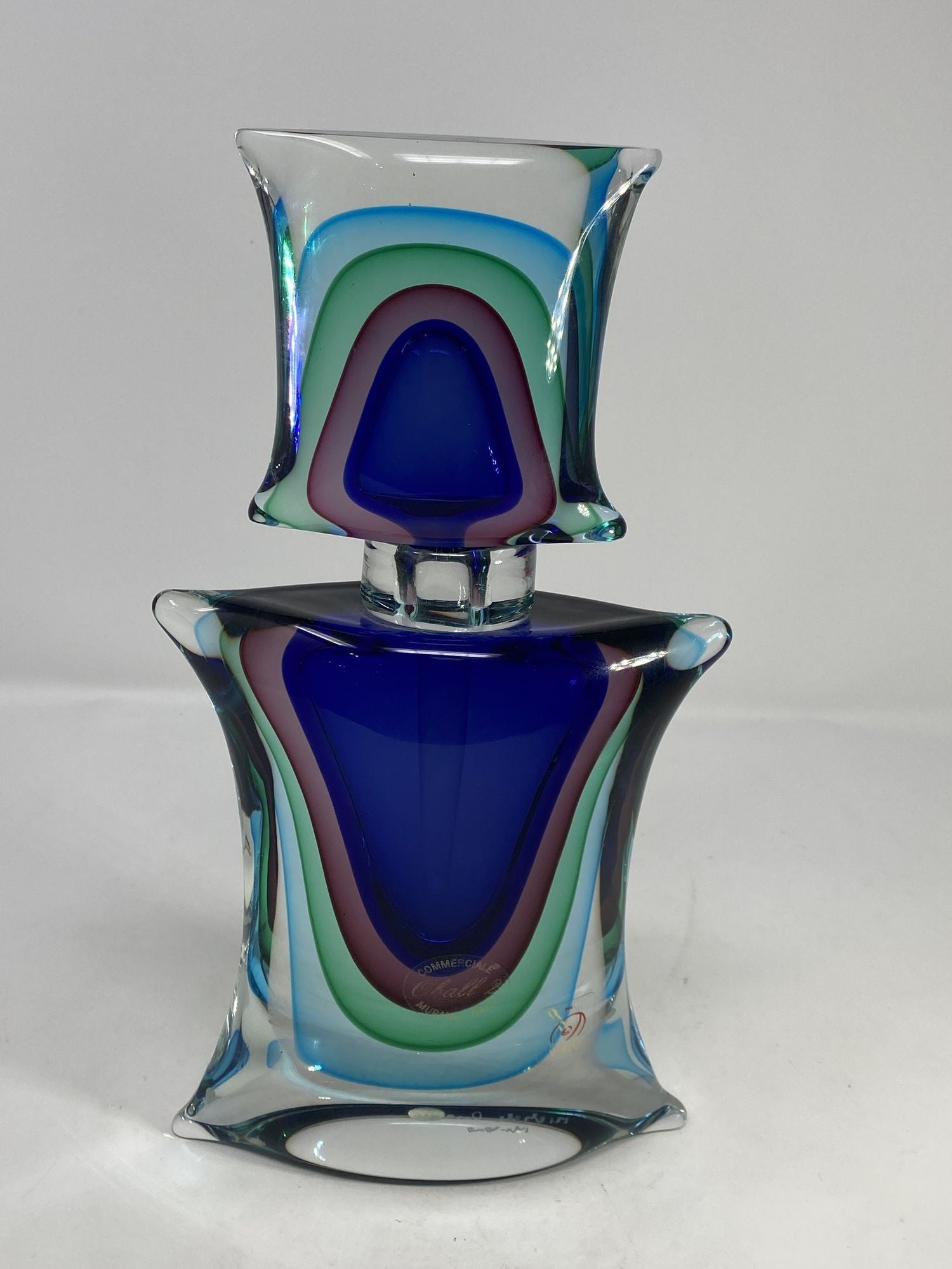 Gorgeous Murano Glass Bottle with Stopper, created by the famous Oball Furnaces. Signed. Made using the Sommerso method. Spectacular colors. Measures 11" high.