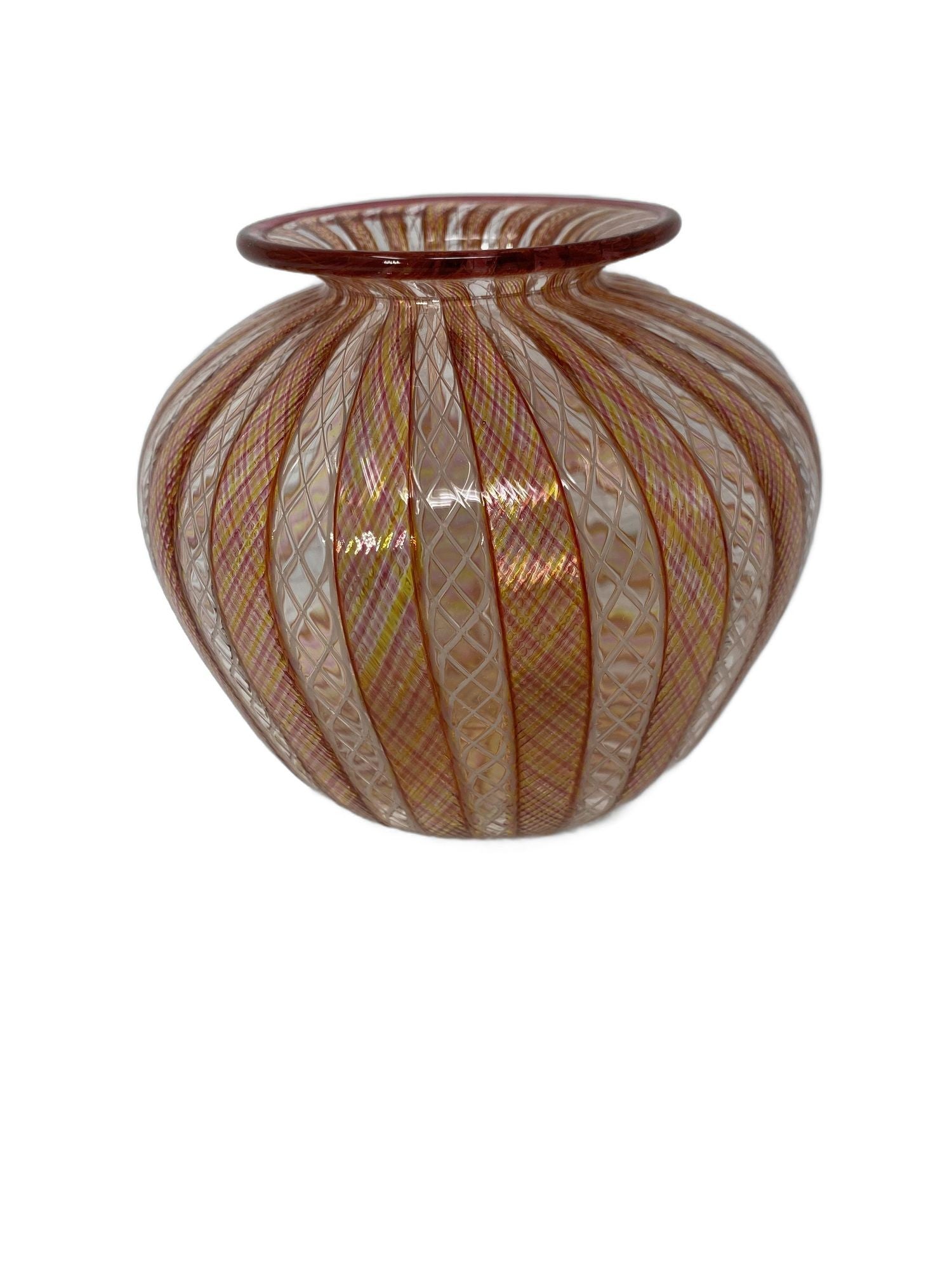 Lovely vintage vase with a spectacular example of filligrana styling. In very good condition for its age. Measures 4.5" high x 5.5" across.