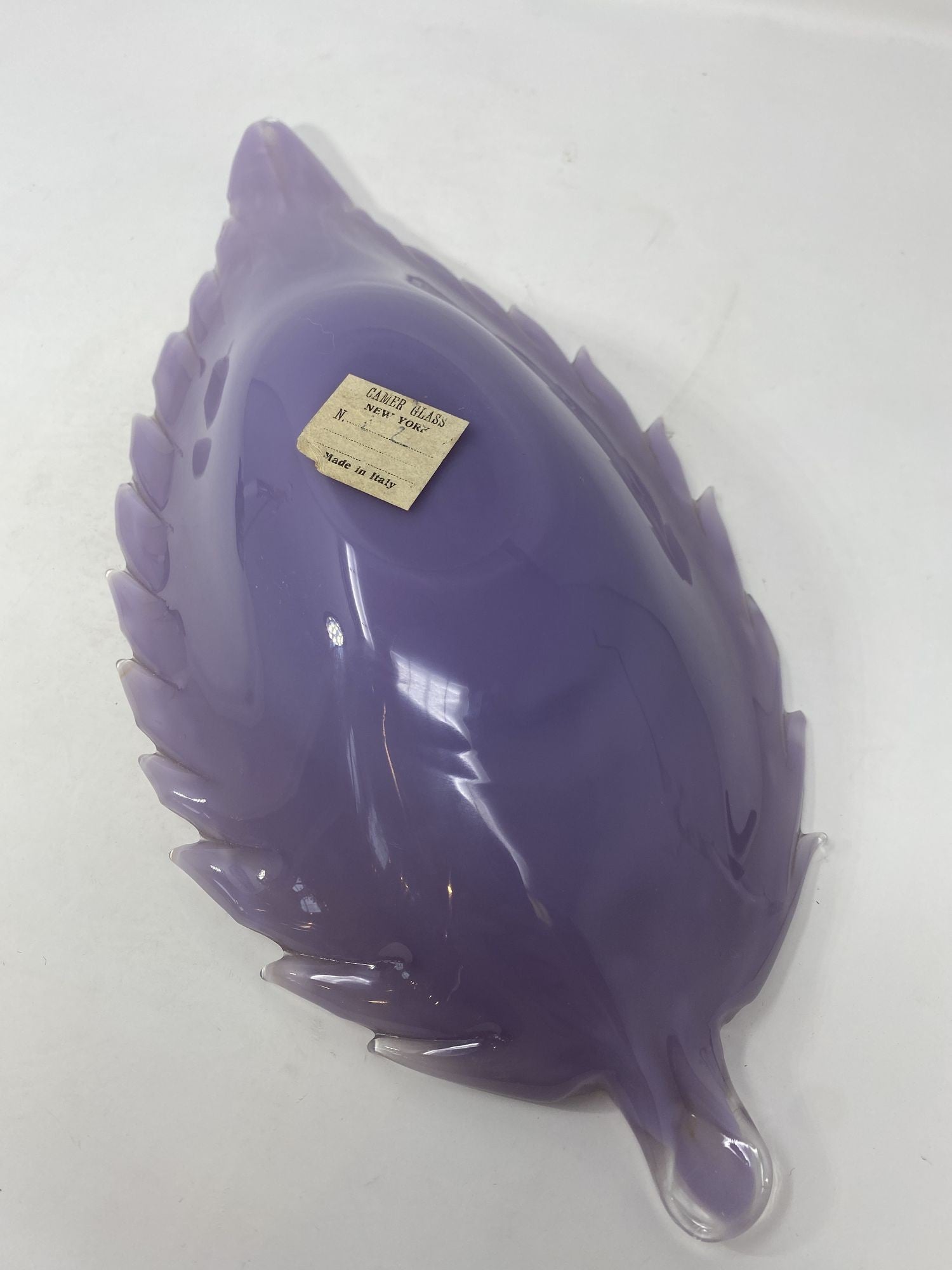 This lovely candy dish from Murano was made by Camer Glass. The label still is visible on the bottom. Unusual and beautiful coloring in a bullicante format. A very rare piece for the collector! Measures 12.5" long.